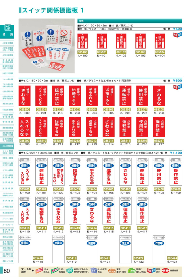 スイッチ関係標識 マグネット付 225×100×0.6mm 表記:点検中 運転禁止 (085415)は、安全用品・安全標識総合カタログ 2019B P.80に掲載されています