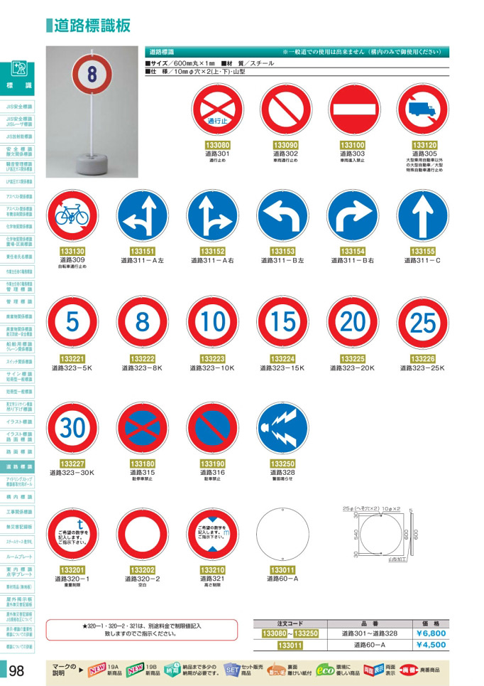 道路標識 600mm丸 表示:車両通行止め (133090)は、安全用品・安全標識総合カタログ 2019B P.98に掲載されています