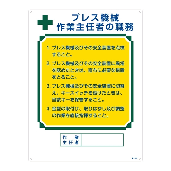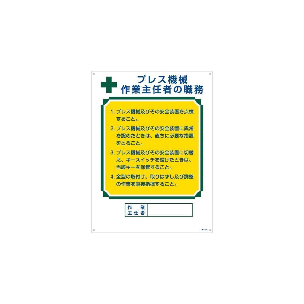 - 作業主任者の職務標識 600×450×1mm 表記:プレス機械・・ (049505)