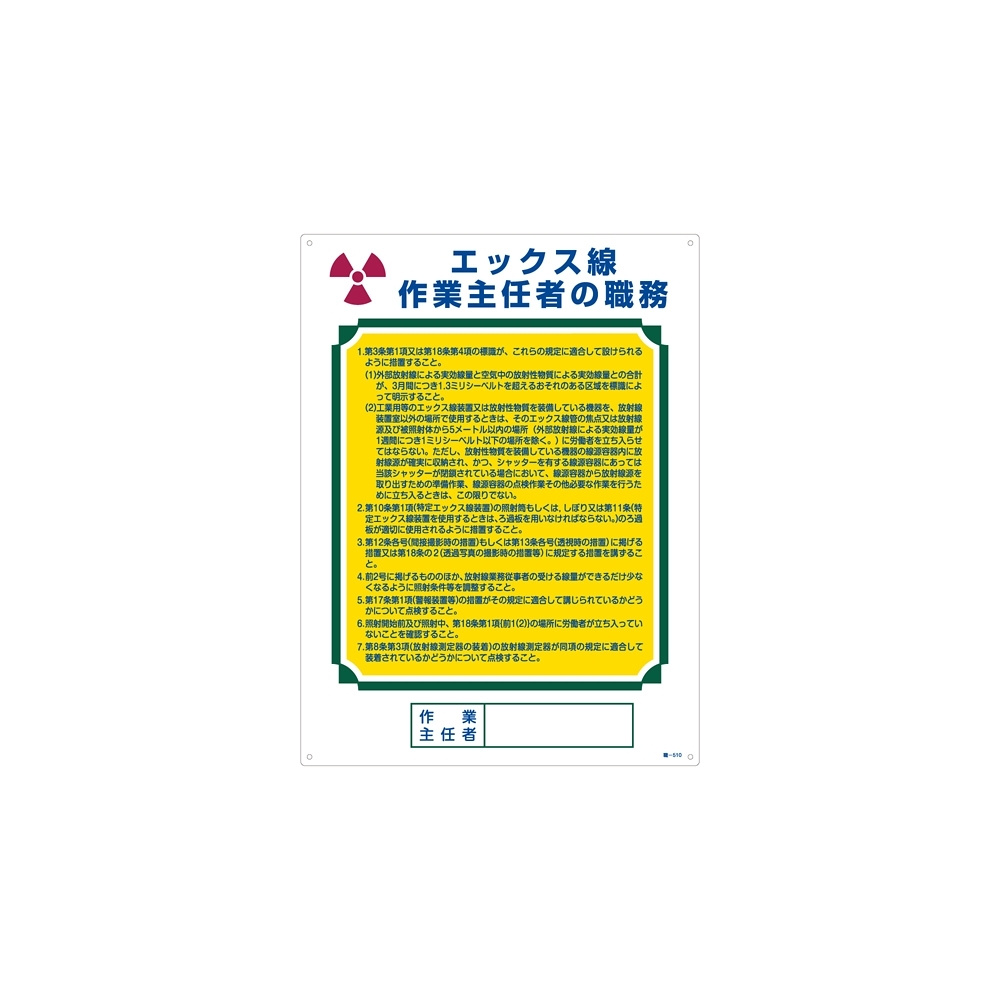 - 作業主任者の職務標識 600×450×1mm 表記:エックス線・・ (049510)
