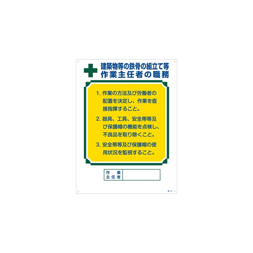 - 作業主任者の職務標識 600×450×1mm 表記:建築物等の鉄骨の組立て等・・ (049517)