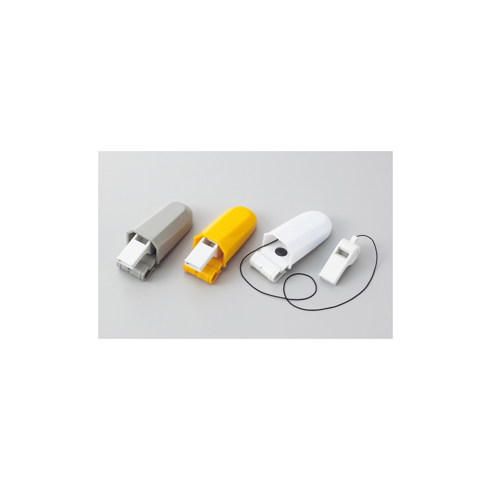 • ヘルメットに装着します。ホイッスルをヘルメット上に収納するので、なくしたりひもによる事故を防ぎます。ひもはリール式で戻り、出したまま固定もできます。