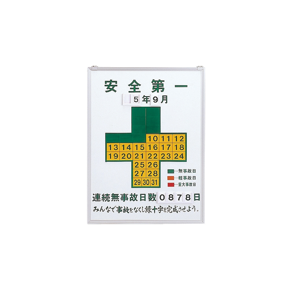 - 印刷された日カレンダーに、無事故・無災害日は緑色、事故・災害日は橙色・赤色のマグネットをそれぞれ貼り、緑十字を完成させます。